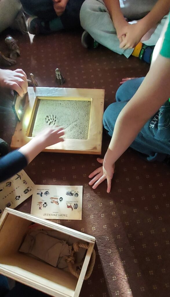 Nie tak dawno w naszym przedszkolu gościliśmy Pana Kacpra z Centrum Edukacji Ekologicznej w Myślęcinku. W zajęciach poświęconym tematyce drzew oraz zwierząt leśnych uczestniczyły: grupa A2 ,,Gumisie” oraz grupa A3 ,,Sowy”. Podczas spotkania Pan Kacper przybliżył dzieciom budowę drzewa. Przy użyciu lupy, dzieci mogły same ocenić, ile dane drzewo mogło mieć lat. Ponadto, dzieci mogły z bliska przyjrzeć się śladom zwierząt leśnych. Każde dziecko mogło odcisnąć na piasku ślad wybranego zwierzęcia.