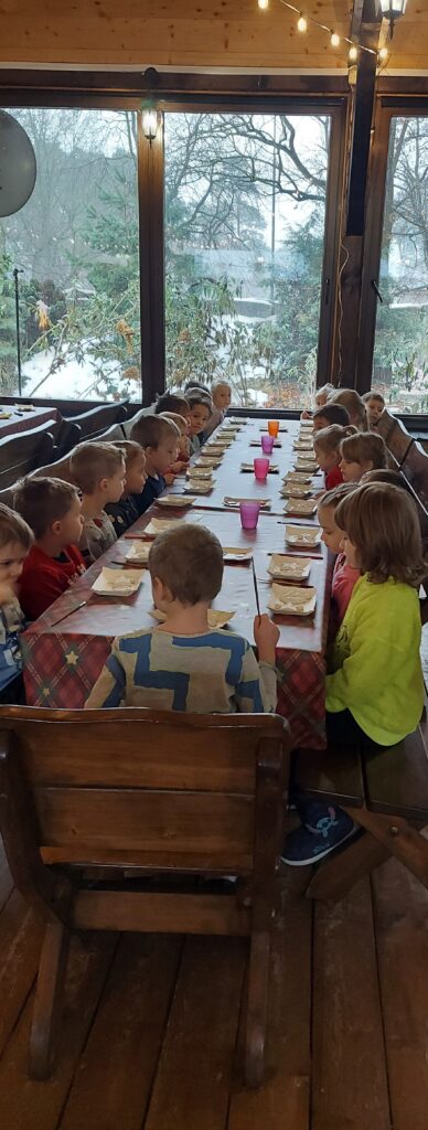 W grudniu, grupa A1 ,,Biedronki” oraz grupa A2 ,,Gumisie” uczestniczyły w wycieczce do Solca Kujawskiego, by tam móc spotkać się ze Św. Mikołajem. 🙂 Dzieci były bardzo podekscytowane, a zarazem troszkę onieśmielone spotkaniem ze Świętym. 🙂 Dzieci wzięły również udział w zajęciach plastycznych, podczas których pomalowały farbkami gipsowe ozdoby choinkowe. Na dzieci czekał również krótki świąteczny seans filmowy. Po seansie filmowym, dzieci odwiedziły Muzeum Ziemi. Z bliska, z zapartym tchem, przyglądały się eksponatom przedstawiających dinozaury. Na zakończenie wycieczki, dzieci przejechały się kolorową kolejką. Co to była za radość! 🙂