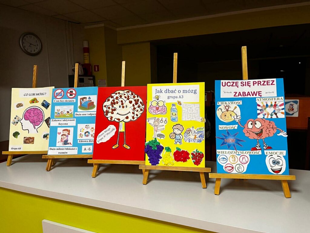 W przedszkolu 18 marca obchodzono Europejski Dzień Mózgu w radosnej i twórczej atmosferze. Dzieci uczestniczyły w różnorodnych zajęciach rozwijających obie półkule mózgu, ćwicząc koncentrację, pamięć oraz logiczne myślenie poprzez zabawy i „gimnastykę umysłu”. Przedszkolaki wykonały także kolorowe plakaty, na których przedstawiły, jak dbać o mózg – podkreślając znaczenie zdrowego odżywiania, ruchu, snu i nauki. Był to dzień pełen ciekawych doświadczeń, który w przystępny sposób przybliżył dzieciom, jak ważną rolę odgrywa mózg w codziennym życiu.