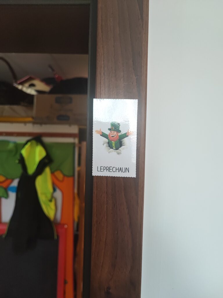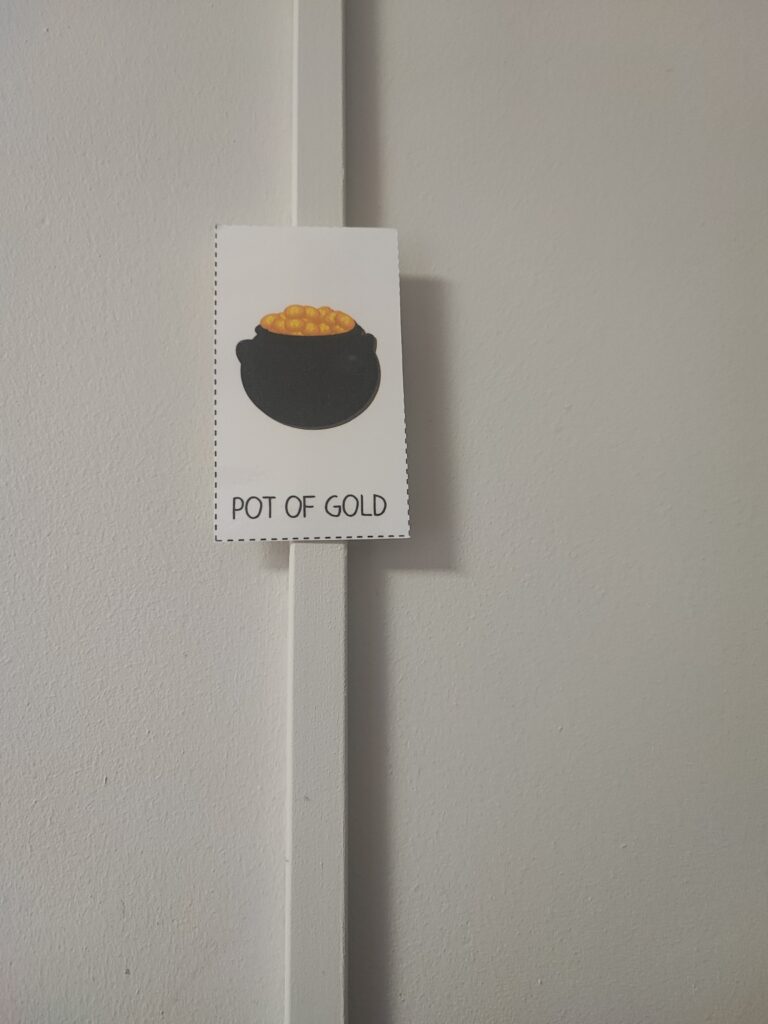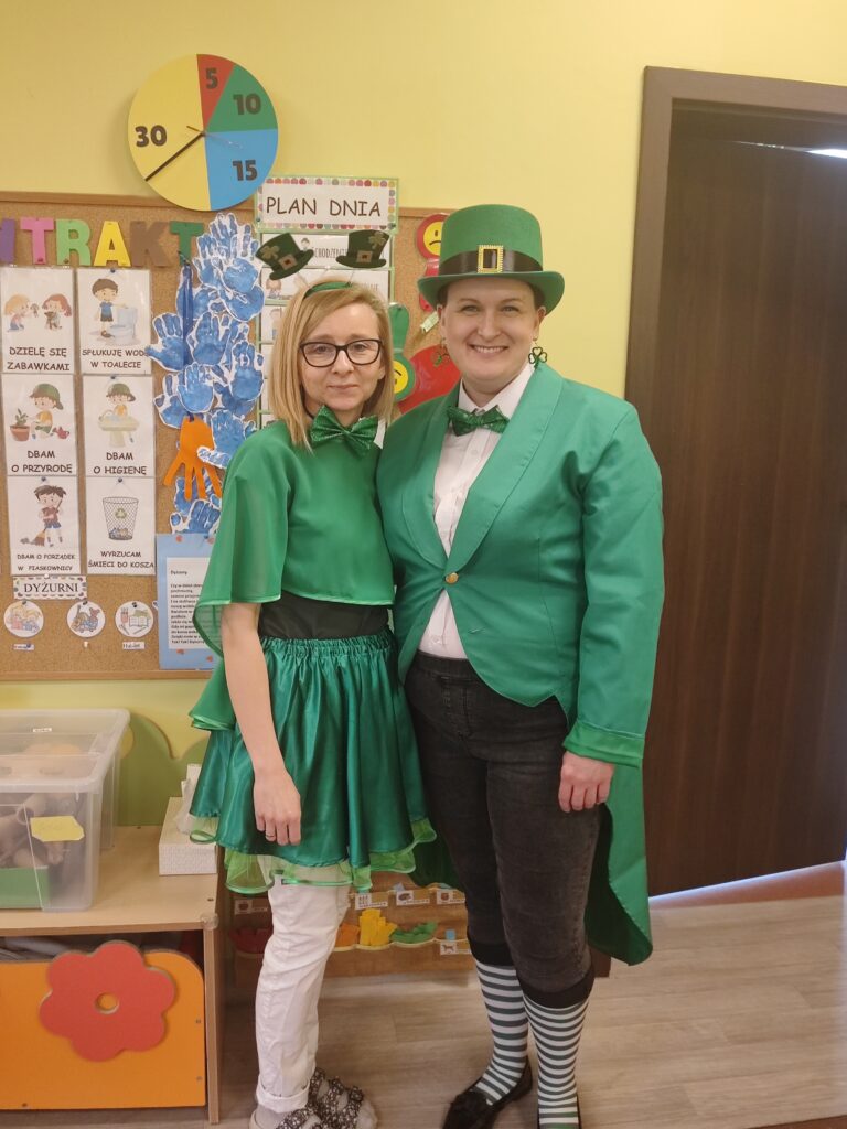, legendę o skrzacie Leprechaunie, tańczyły tradycyjny irlandzki taniec. Po wykonaniu wszystkich zadań dzieci, zgodnie z legendą, szukały na podstawie wskazówek skarbu ukrytego przez Leprechauna na końcu tęczy i znalazły go w gabinecie pani Dyrektor