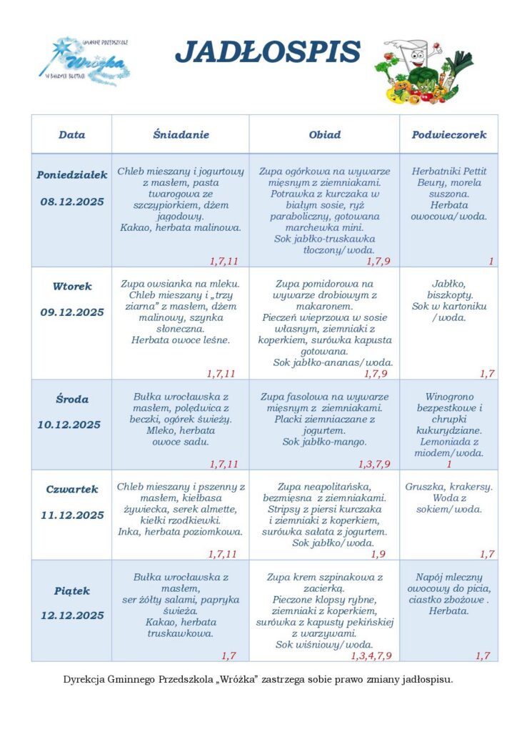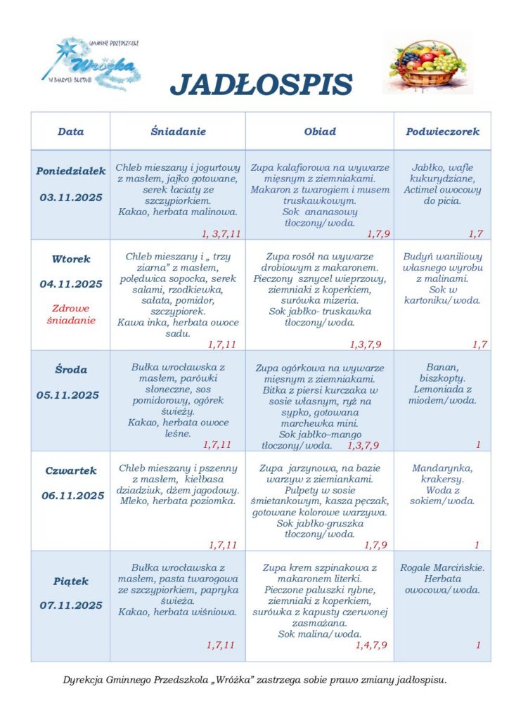 Zgodnie z rozporządzeniem Parlamentu Europejskiego i Rady Nr 1169/2011 w sprawie przekazywania konsumentom informacji na temat żywności, które ze szczególnym uwzględnieniem alergenów, muszą być łatwo dostępne tak, aby rodzic miał świadomość, że w odniesieniu do danej żywności występują kwestie związane z alergiami i nietolerancją pokarmową. Informujemy, że w naszej przedszkolnej kuchni przygotowując codzienne posiłki, wykorzystujmy składniki, które mogą powodować alergie lub reakcje nietolerancji. W związku z powyższym pod jadłospisem będzie można znaleźć spis alergenów, a przy każdym daniu numer alergenu jaki zawiera to danie.