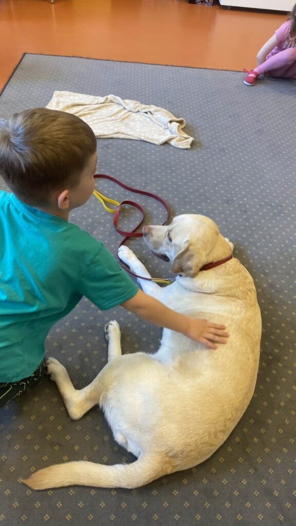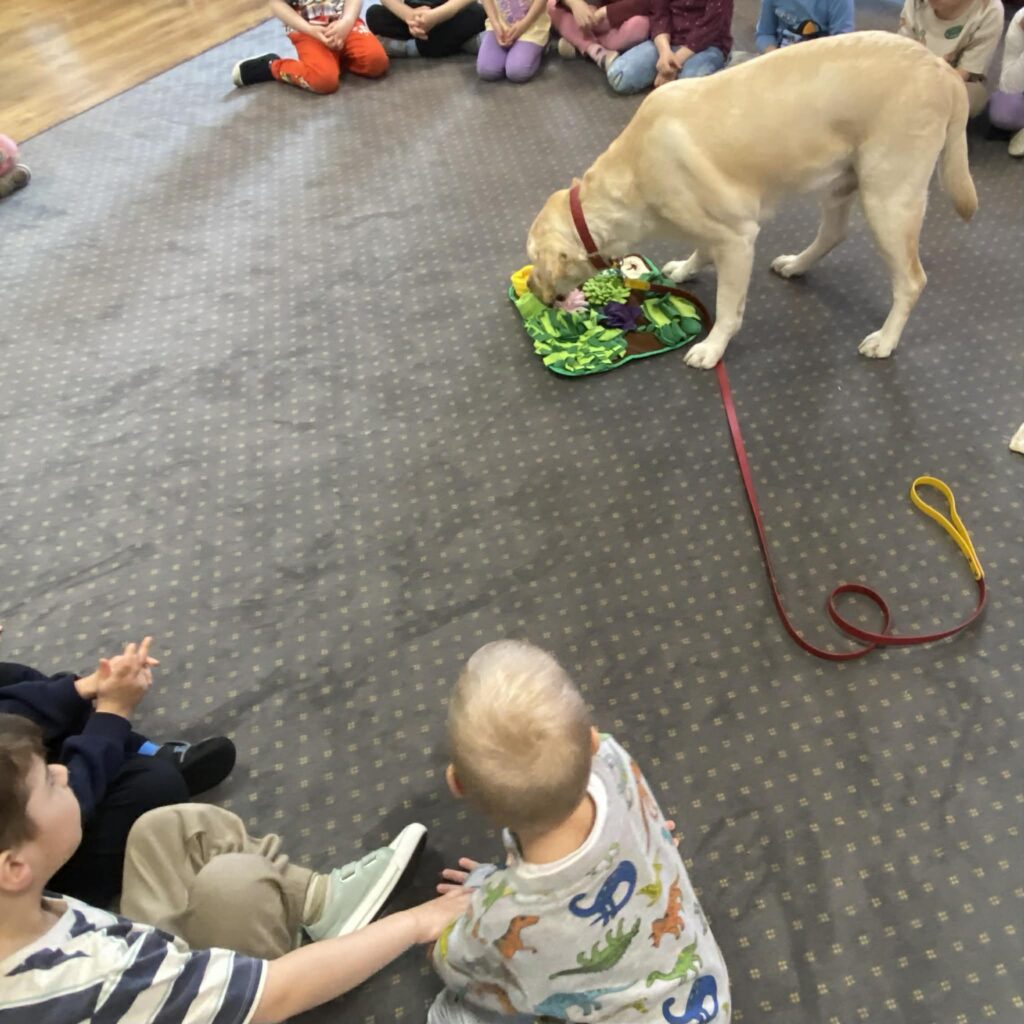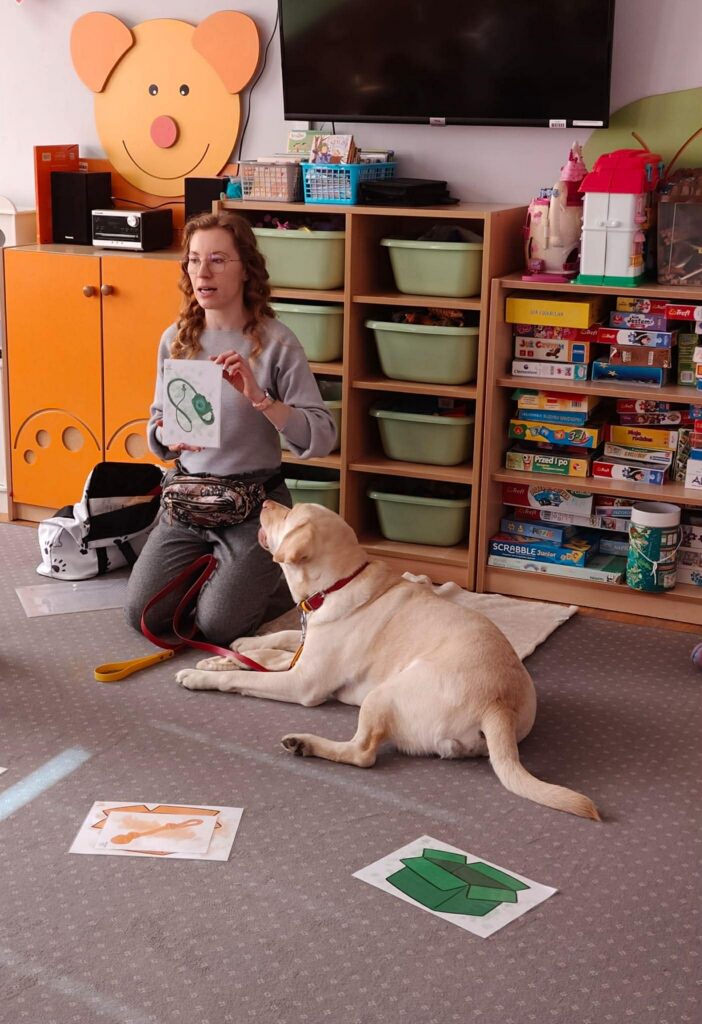 Wszystkie grupy przedszkolne odwiedziła Pani Ola – kynoterapeutka i Obi – pies terapeuta. Podczas tych spotkań dzieci uczą się właściwego podejścia do zwierzęcia, poznają jego potrzeby oraz zasady odpowiedzialnej opieki. Istotnym elementem spotkania był również temat bezpieczeństwa w kontakcie z obcymi psami. Dzieci poznały podstawowe zasady ostrożnego zachowania, takie jak unikanie nagłych ruchów, nie podchodzenie do nieznanego psa bez zgody właściciela oraz zachowanie spokojnej postawy. Omówiona i przećwiczona została także tzw. pozycja bezpieczna, którą należy przyjąć w sytuacji zagrożenia – dzieci wiedzą, jak chronić ciało i zachować się w kontakcie z nieznanym lub zdenerwowanym zwierzęciem. Wspólne działania sprzyjają budowaniu więzi zarówno ze zwierzęciem, jak i rówieśnikami.
