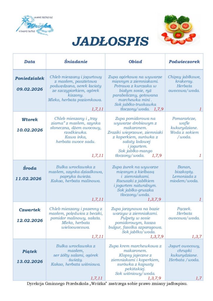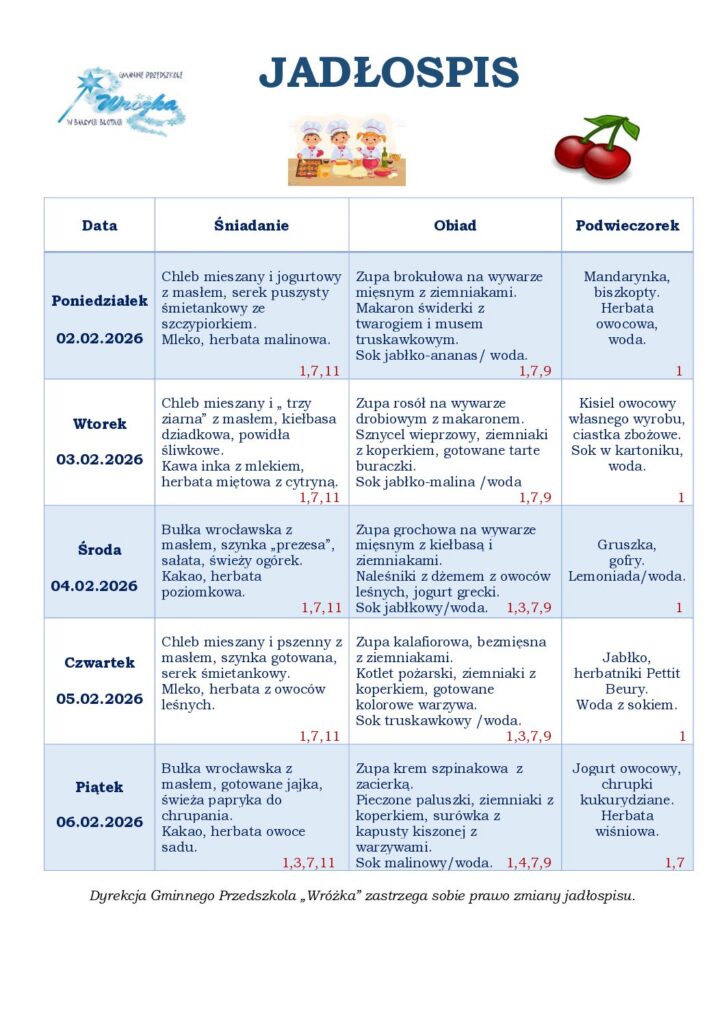 Zgodnie z rozporządzeniem Parlamentu Europejskiego i Rady Nr 1169/2011 w sprawie przekazywania konsumentom informacji na temat żywności, które ze szczególnym uwzględnieniem alergenów, muszą być łatwo dostępne tak, aby rodzic miał świadomość, że w odniesieniu do danej żywności występują kwestie związane z alergiami i nietolerancją pokarmową. Informujemy, że w naszej przedszkolnej kuchni przygotowując codzienne posiłki, wykorzystujmy składniki, które mogą powodować alergie lub reakcje nietolerancji. W związku z powyższym pod jadłospisem będzie można znaleźć spis alergenów, a przy każdym daniu numer alergenu jaki zawiera to danie.
